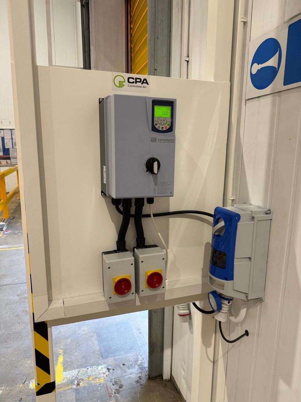 Given the high frequency of door operation, we further enhanced the solution by installing an Enershield Air Barrier. The system is interlocked with the high-speed door and automatically activates whenever the door is open, creating a controlled air stream across the opening, significantly reducing warm air ingress and cold air loss.